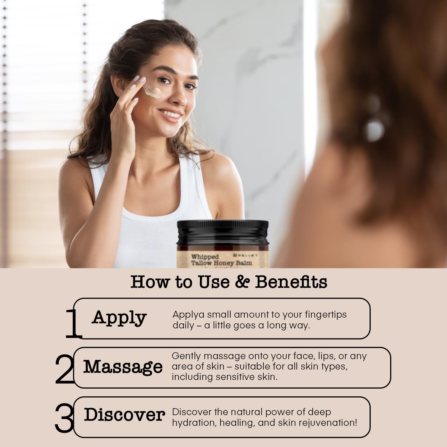 Organic & Multi-Functional: Made from organic, natural ingredients, this tallow and honey balm for face is free from synthetic chemicals. Suitable for use on the face as a tallow face moisturizer or on the body as a nourishing lotion, it offers versatile skincare for all your needs.