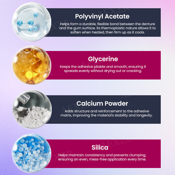 Silica gives the adhesive a soft, moldable texture during application, allowing it to adapt effortlessly to your gum contours. It helps maintain consistency and prevents clumping, ensuring an even, mess-free application every time.